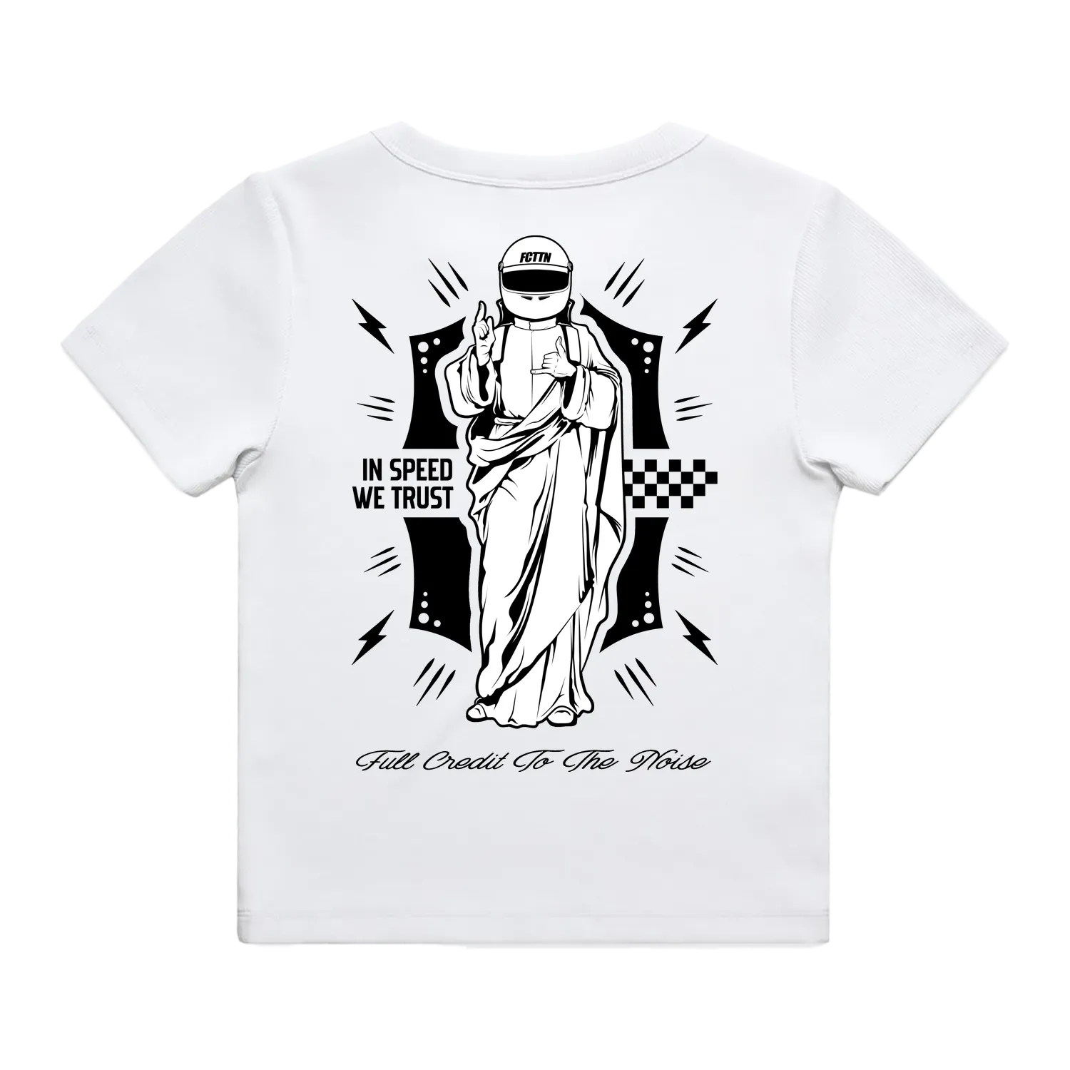 The In Speed We Trust design is all about one thing - worship. If your one true belief is going as fast as possible then this is the tee for you.
